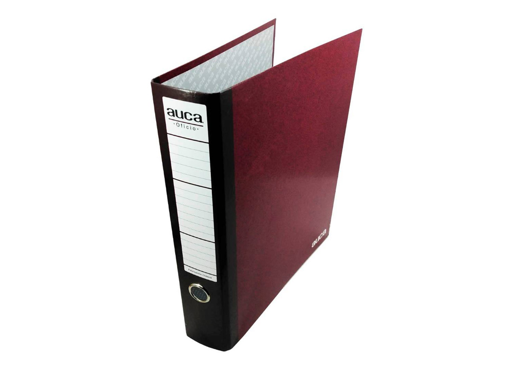 Archivador de lomo ancho tamaño oficio Auca color café oscuro, de 2 anillos metálicos sujetadores de hojas con una capacidad de almacenajes de 450 hojas aproximadamente.